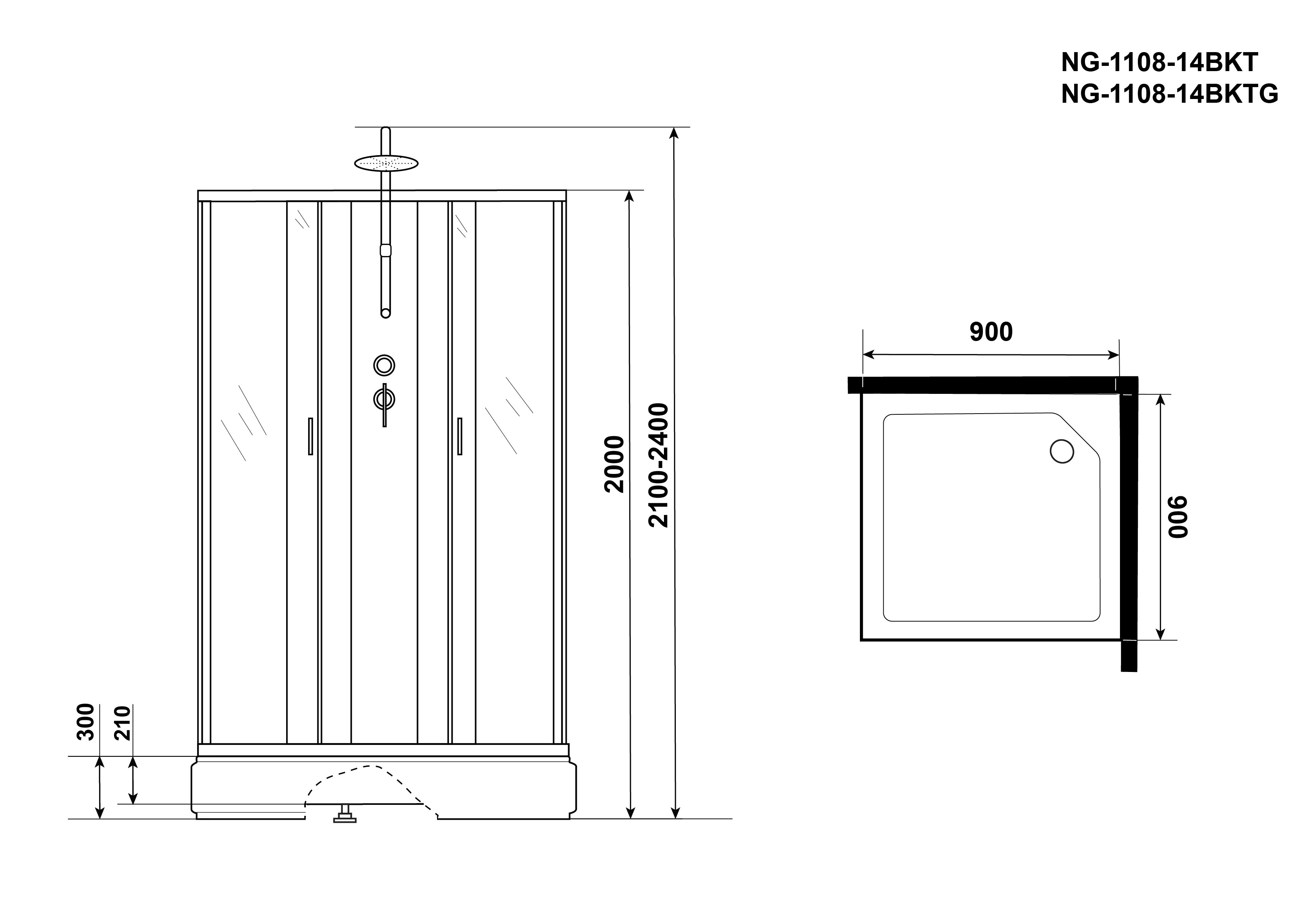 Душ.каб. NG-1108-14BKTG (900х900х2100-2400) средний поддон(26см) стекло МАТОВОЕ 4 места с полкой