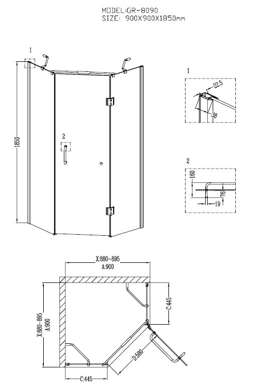 Душ.ограждение GR-8090 Classic 90*90*185 трапеция, дверь распашная 2 места