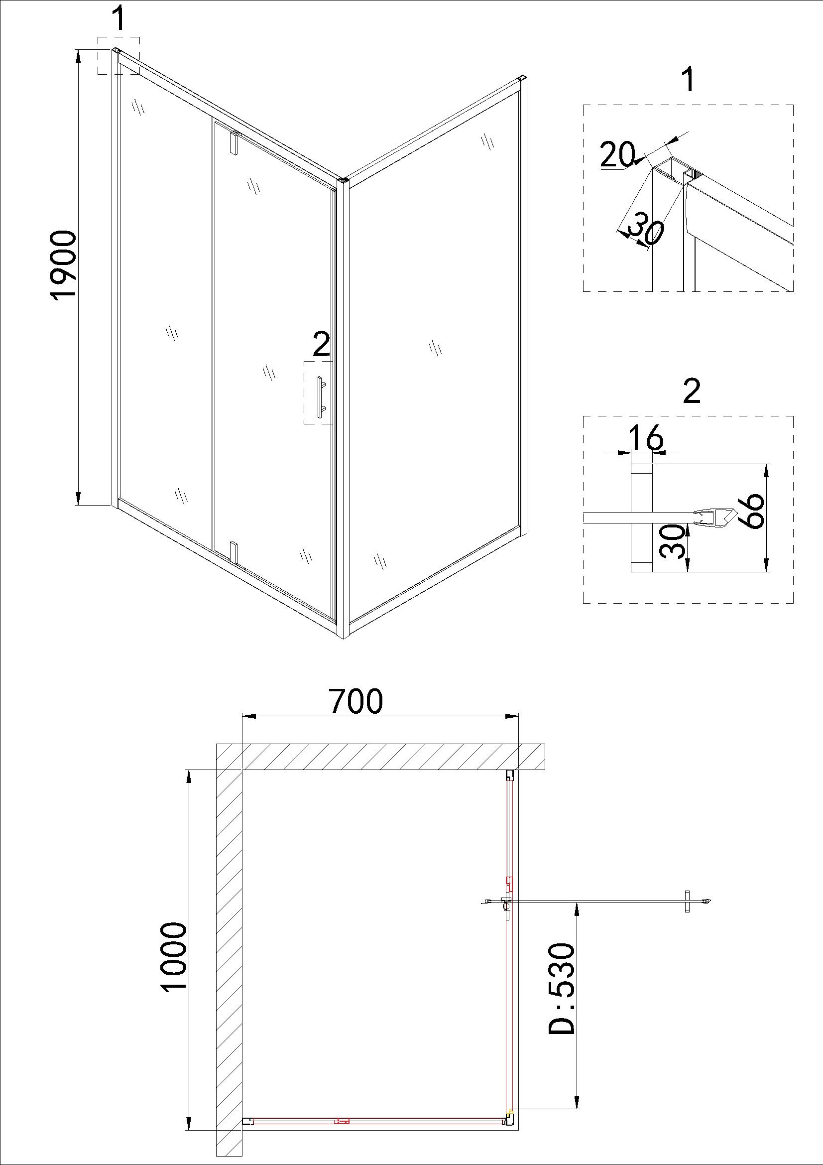 Душ.ограждение NG-43-10AG-A70G (100*70*190) прямоугольник, дверь распашная, 2 места