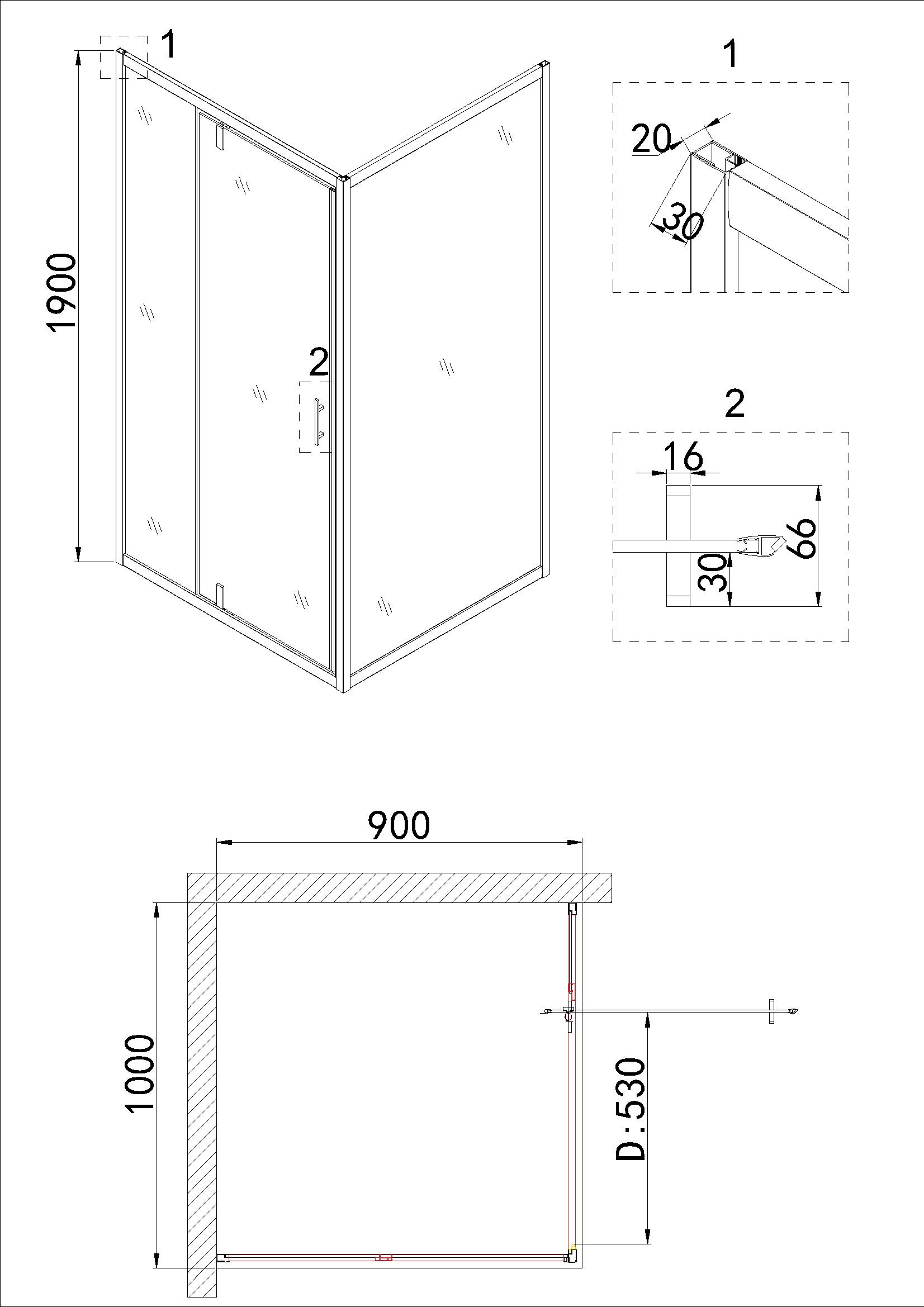 Душ.ограждение NG-43-10AG-A90G (100*90*190) прямоугольник, дверь распашная, 2 места