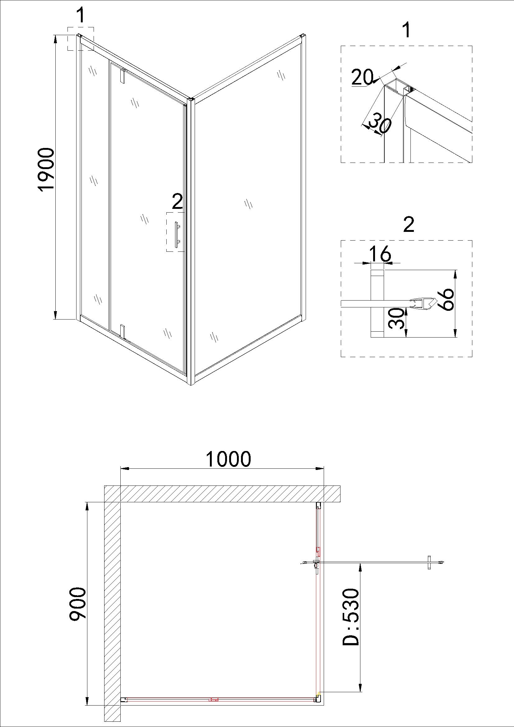 Душ.ограждение NG-43-9AG-A100G (90*100*190) прямоугольник, дверь распашная, 2 места