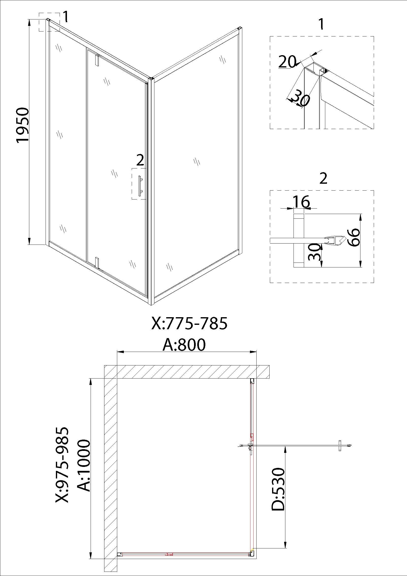 Душ.ограждение NG-83-10AB-A80B (100*80*195) прямоугольник, дверь распашная, 2 места