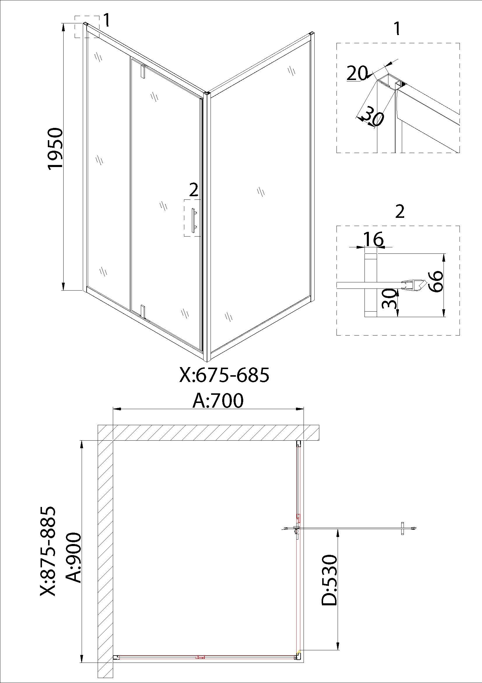 Душ.ограждение NG-83-9AB-A70B (90*70*195) прямоугольник, дверь распашная, 2 места