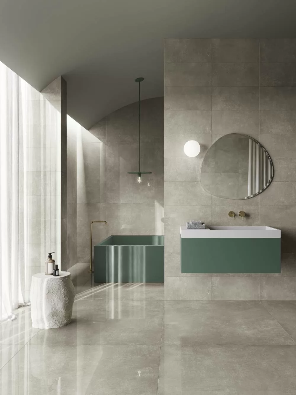 Итальянская натуральная с антискользящим покрытием плитка Refin Feel Dark Matt Rt 60x120 прямоугольной формы, размера 60x120, белого цвета. Данный вид плитки, имитирующей бетон, подойдет для стены и пола Вашей ванной.