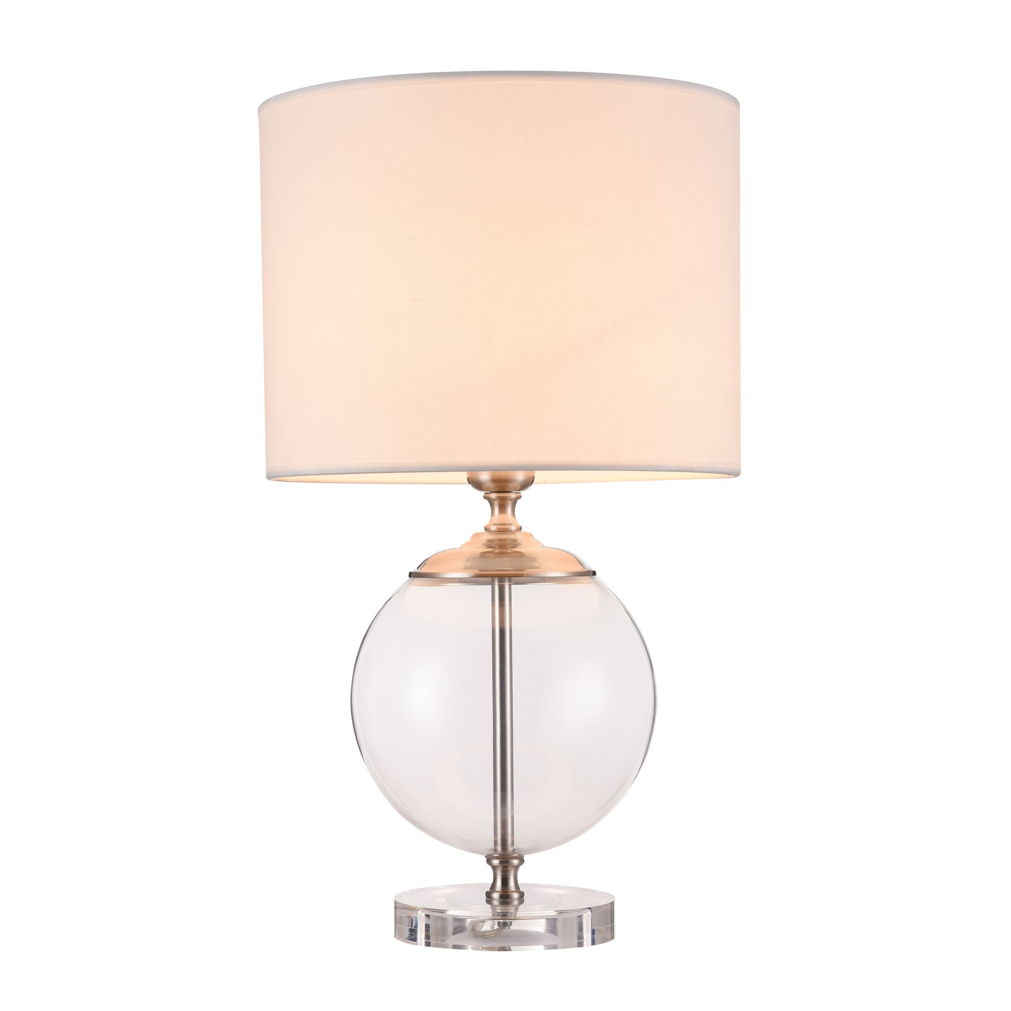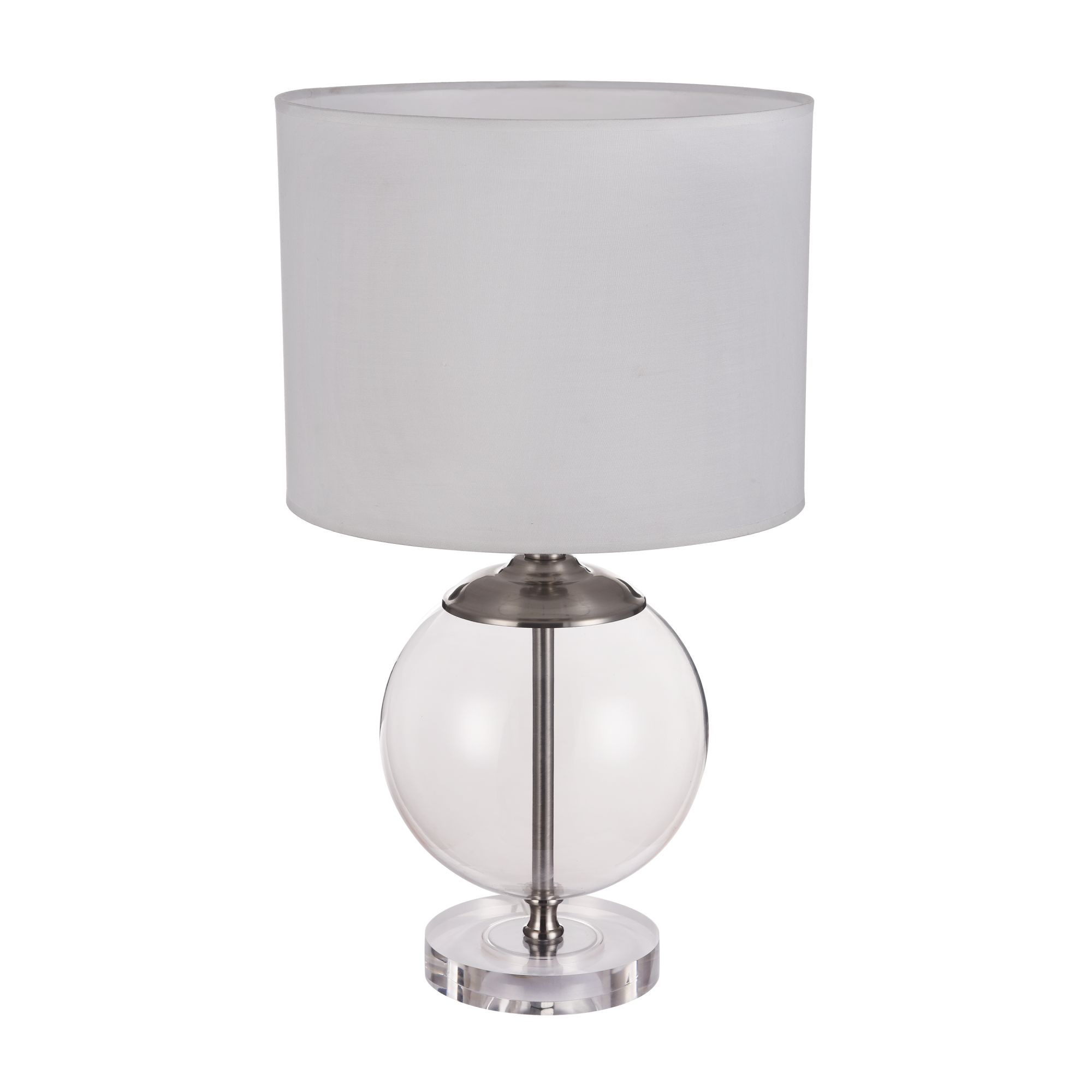 Настольная лампа, которая с легкостью поддержит композицию при создании интерьера. Основание изготовлено из прозрачного акрила и дополнено шаром из выдувного стекла. Металлические детали покрыты гальваническим способом в цвет никель. Абажур изготовлен из ткани, нанесенной на ПВХ.