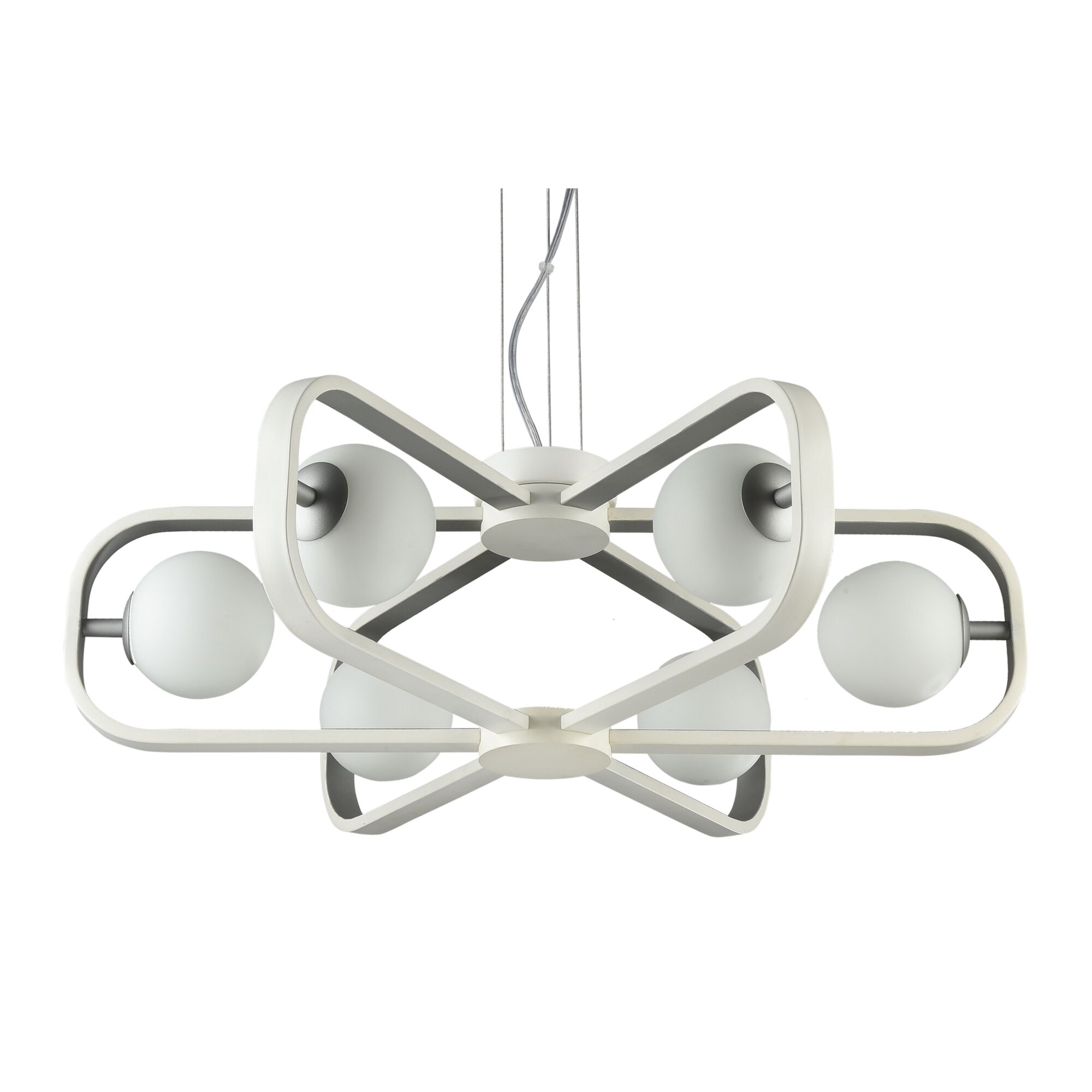Символизируя вечное движение, светильники серии наполнят живостью и динамичностью освещаемое пространство. Чтобы подчеркнуть изогнутые линии металлического каркаса, использована золотая и серебряная краска. Опаловые плафоны в форме шаров изготовлены из выдувного стекла. Высоту подвесных светильников можно регулировать длиной троса или шнура.