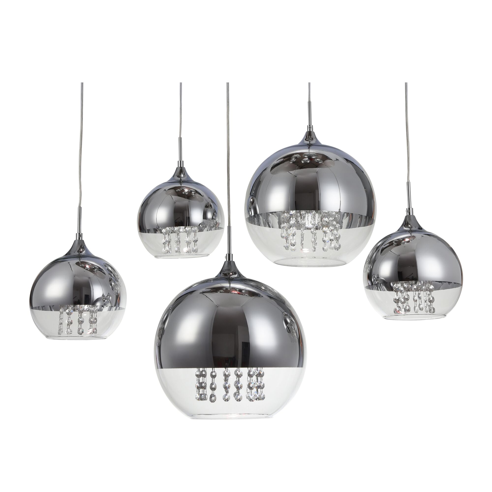 Многочисленные грани декоративных подвесок из кристаллов проецируют цветные блики на глянцевую поверхность стеклянной сферы. Арматура светильников изготовлена из металла и окрашена в два трендовых оттенка на выбор: хром и золото. Высоту светильников можно изменять, регулируя длину шнура. В серии представлены подвесы различного диаметра и люстра на 5 плафонов, что позволяет организовать как центральную, так и зональную подсветку.