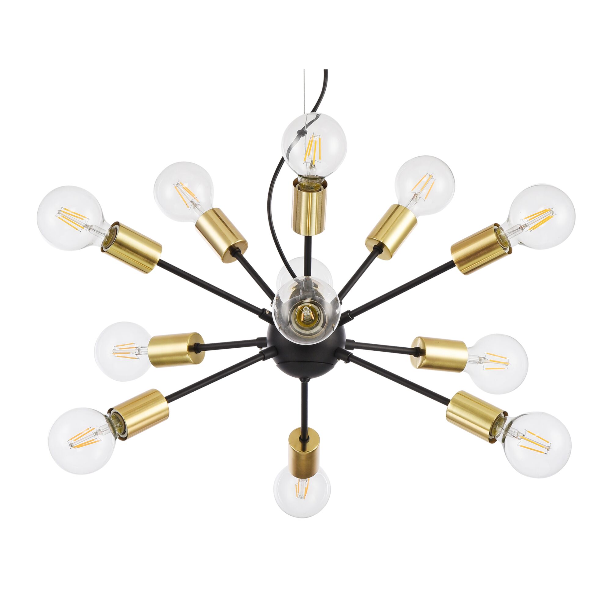 Подвесные светильники серии Jackson в стиле лофт завораживают своим ярким дизайном. Черная арматура дополнена латунными декоративными колпачками, которые закрывают цоколи ламп. Серия представлена моделями разного размера с двеннадцатью и восемнадцатью рожками. Высоту подвесных светильников можно отрегулировать длиной троса.