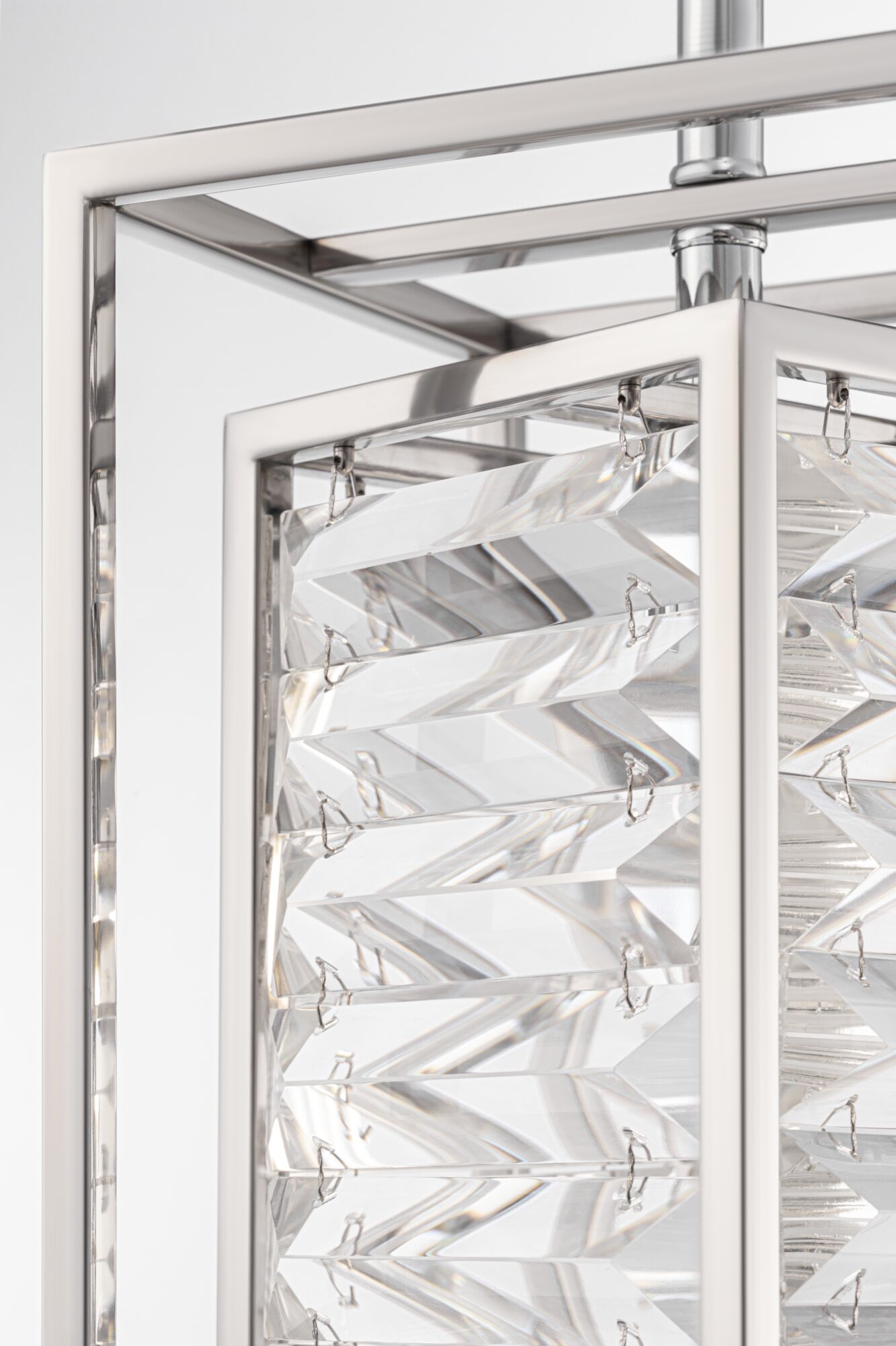 Изысканные искрящиеся кристаллы с трапециевидной огранкой преломляют потоки света, наполняя пространство радужными бликами. Заключенные одна в другой рамы из полированного металла создают ощущение иллюзорности конструкции. Модели серии представлены в двух цветах: хром и золото. Высоту подвесных светильников возможно изменить, регулируя длину цепи.