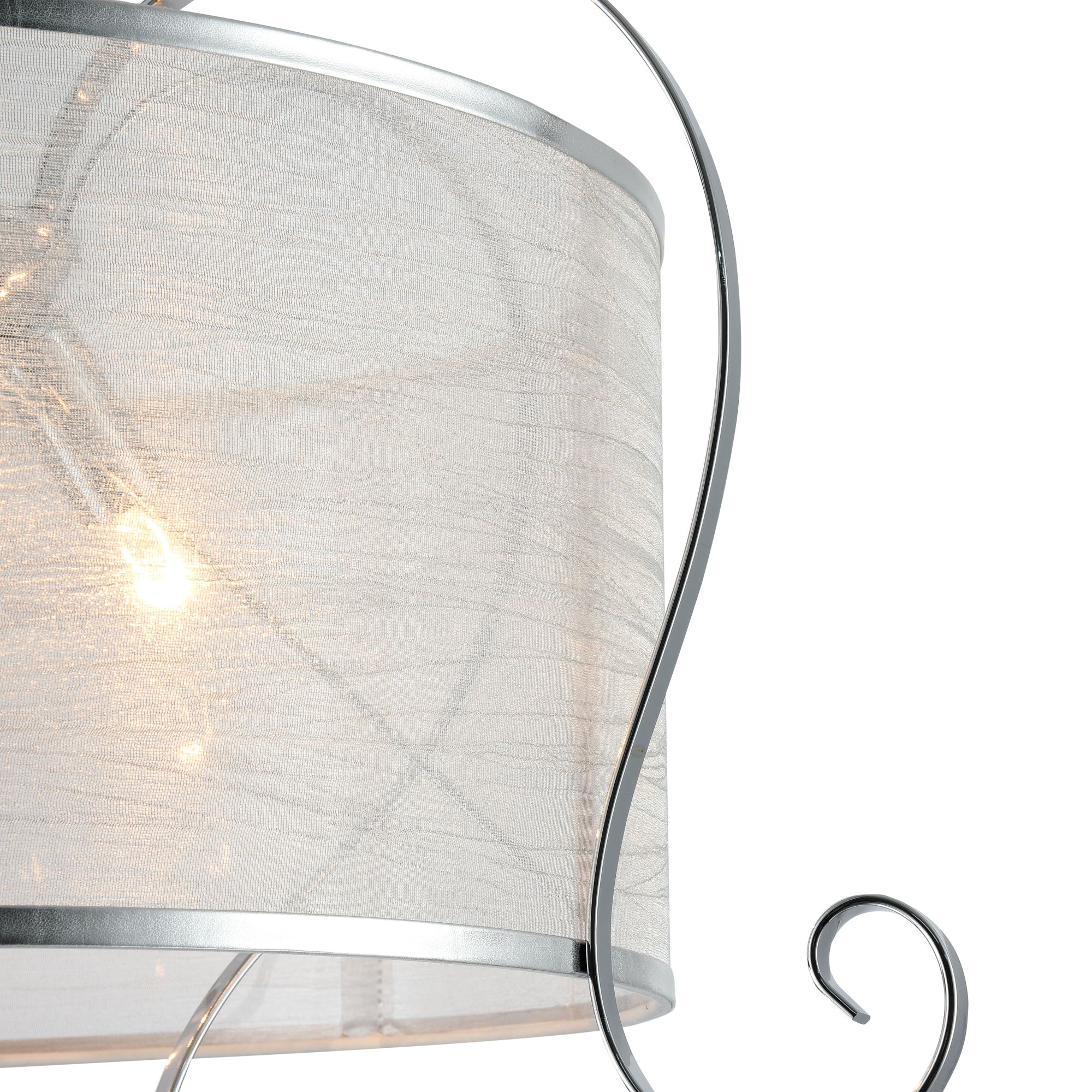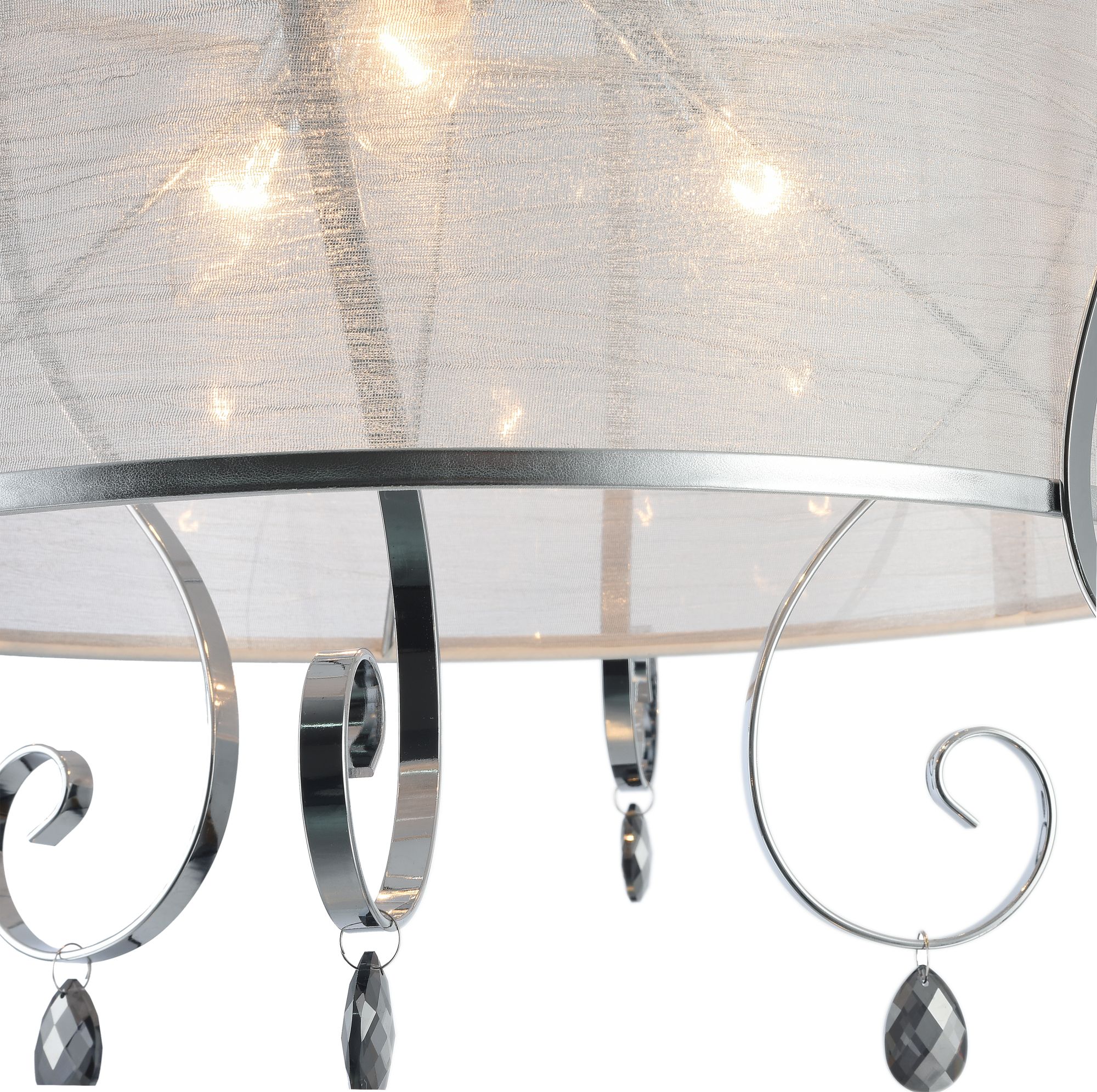 Абажуры и арматура светильников выполнены в разных цветах, с несколькими видами арматуры. Основание люстры украшено стеклянным декоративным элементом, а завитки рожков украшают подвески.