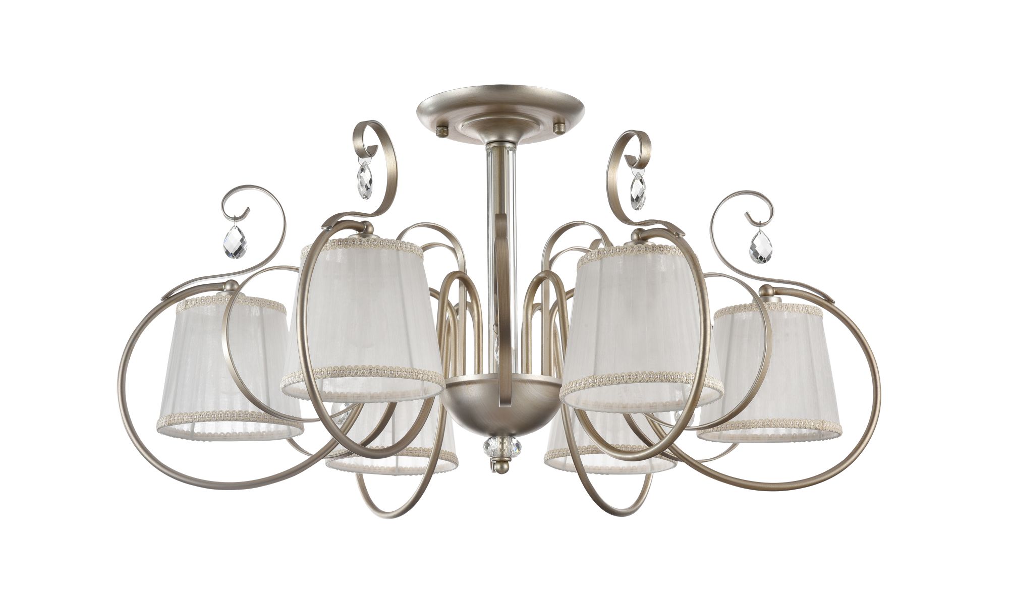 Абажуры и арматура светильников выполнены в разных цветах, с несколькими видами арматуры. Основание люстры украшено стеклянным декоративным элементом, а завитки рожков украшают подвески.