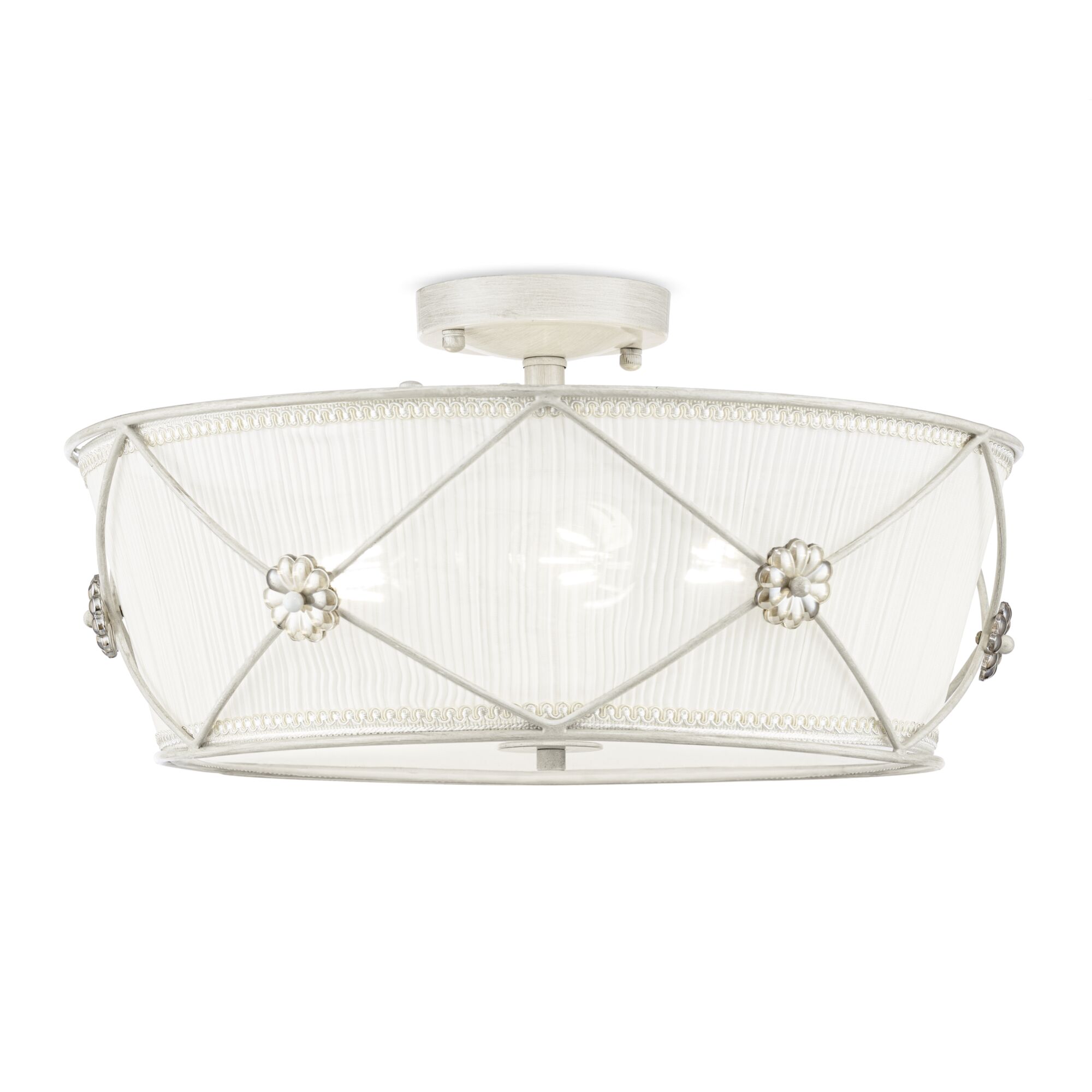 Светлая и по-настоящему домашняя серия светильников погружает освещаемый интерьер в дружественную теплую атмосферу. Золотистая тесьма и декоративные цветы довершают этот образ. Арматура выкрашена в жемчужный белый цвет. Абажуры, заключенные в металлический каркас, являются отличительной чертой светильников серии. Высоту люстр и подвесных светильников возможно регулировать по высоте, изменяя длину цепи.