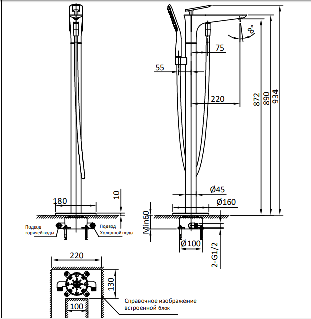 Дополнительные свойства: аэратор с ограничением расхода воды, гибкий полимерный шланг с защитой от залома и гладкой поверхностью, керамический картридж   Комплектация: встраиваемая часть в пол, смеситель, ручной душ,  гибкий полимерный шланг, установочный