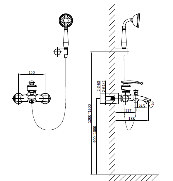 Дополнительные свойства: латунный ручной душ, аэратор с ограничением расхода воды, керамический картридж Комплектация: смеситель настенного монтажа, настенный держатель ручного душа, ручной душ, гибкий металлический шланг, эксцентрики, чаши декоративные