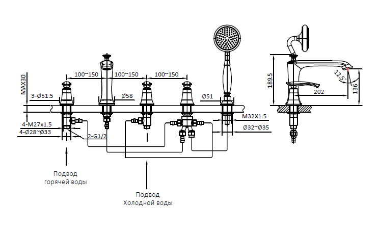 Дополнительные свойства: аэратор с ограничением расхода воды, латунный ручной душ, керамические кранбуксы Комплектация: встраиваемая часть, смеситель, ручной душ, гибкий металлический шланг, установочный комплект