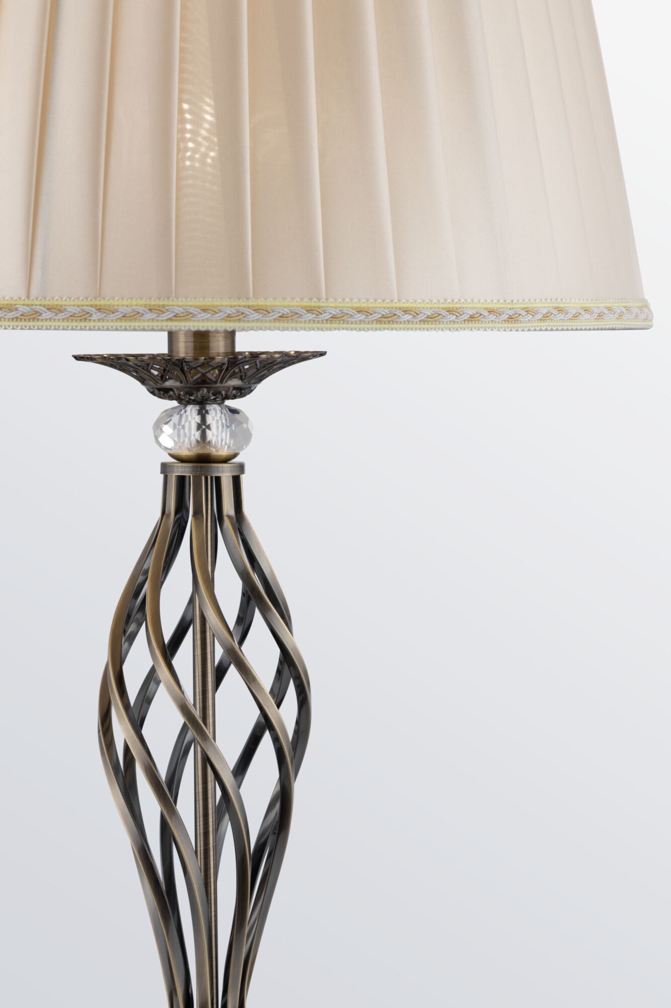 Рожки, украшенные подвесками из кристаллов, и деликатный цвет состаренной бронзы формируют элегантный, немного строгий образ светильников серии. Благодаря необычному, закрученному по спирали основанию, кажется, что вся конструкция светильника находится в движении. Абажур изготовлен из органзы по технологии намотки. Высоту люстр и подвесных светильников возможно регулировать, меняя длину цепи.